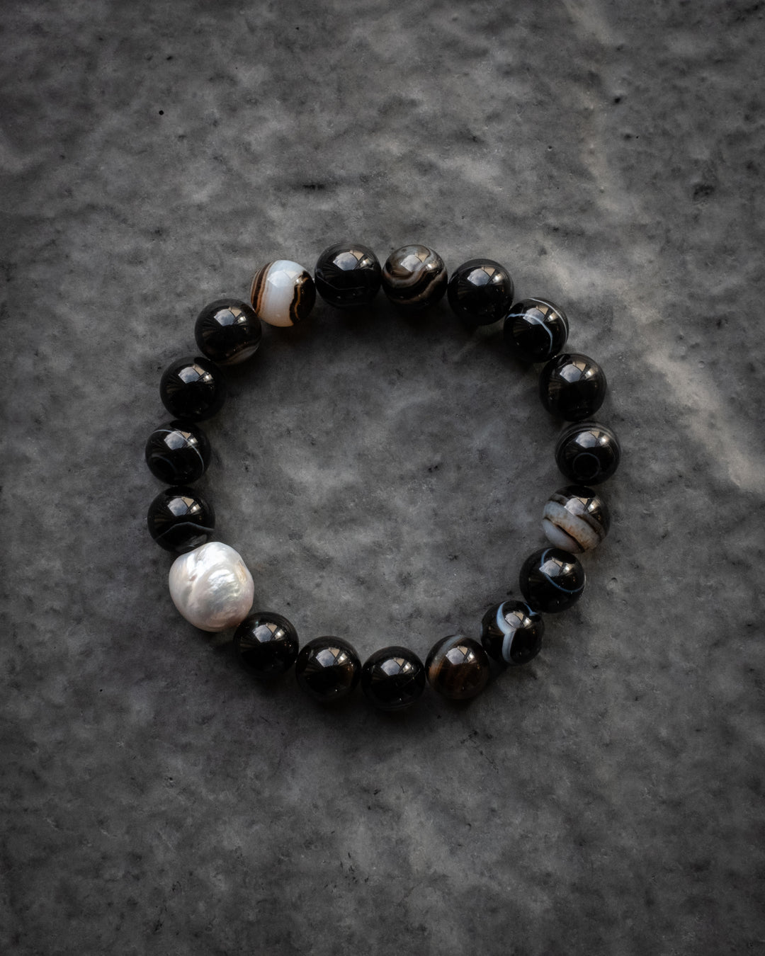 Natural Banded Agate & Vintage Pearl Round Bead Bracelet 14mm