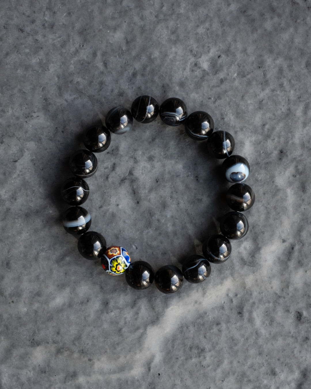 Black Agate & Vintage Millefiori Round Bead Bracelet 10mm