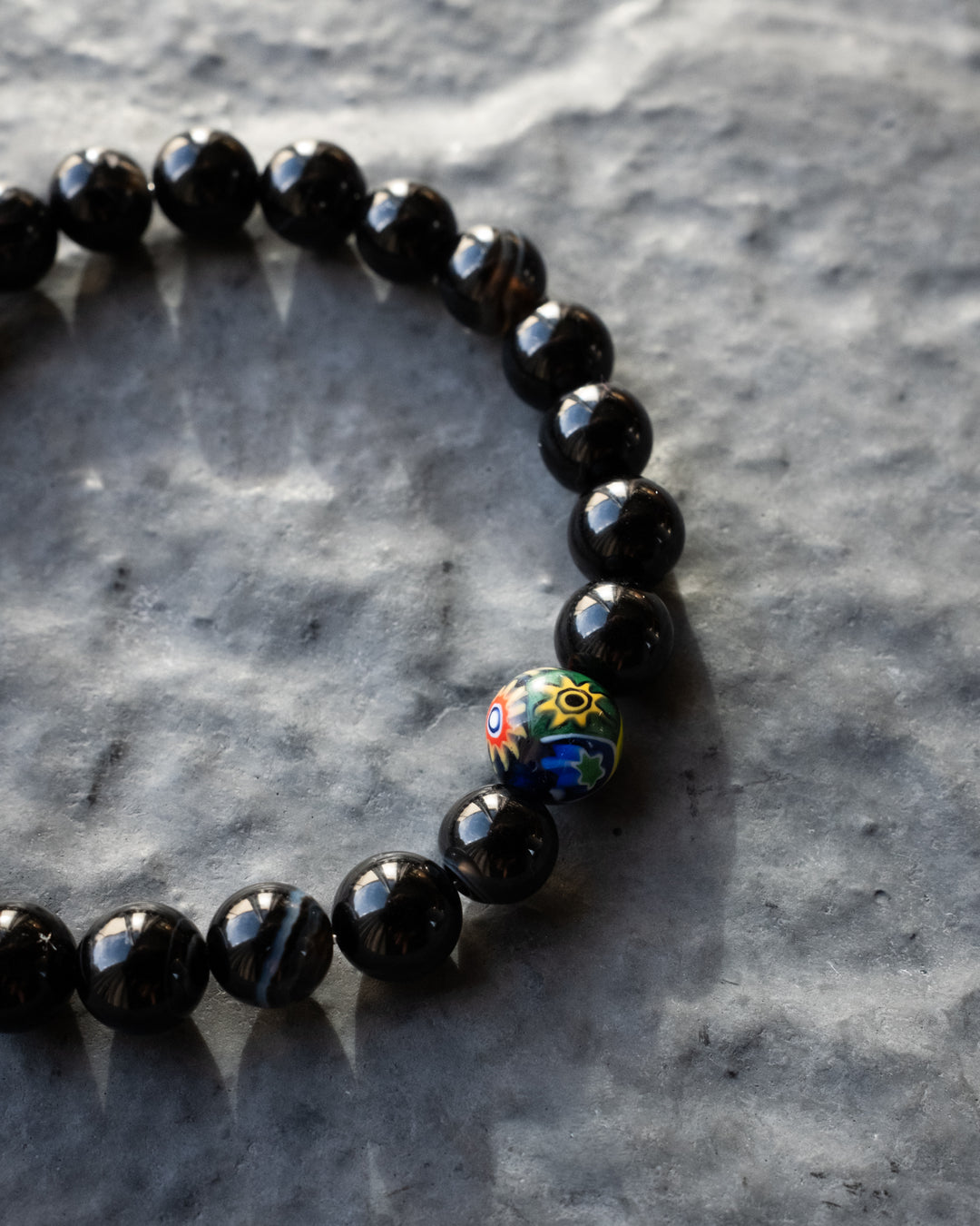 Black Agate & Vintage Millefiori Round Bead Bracelet 8mm