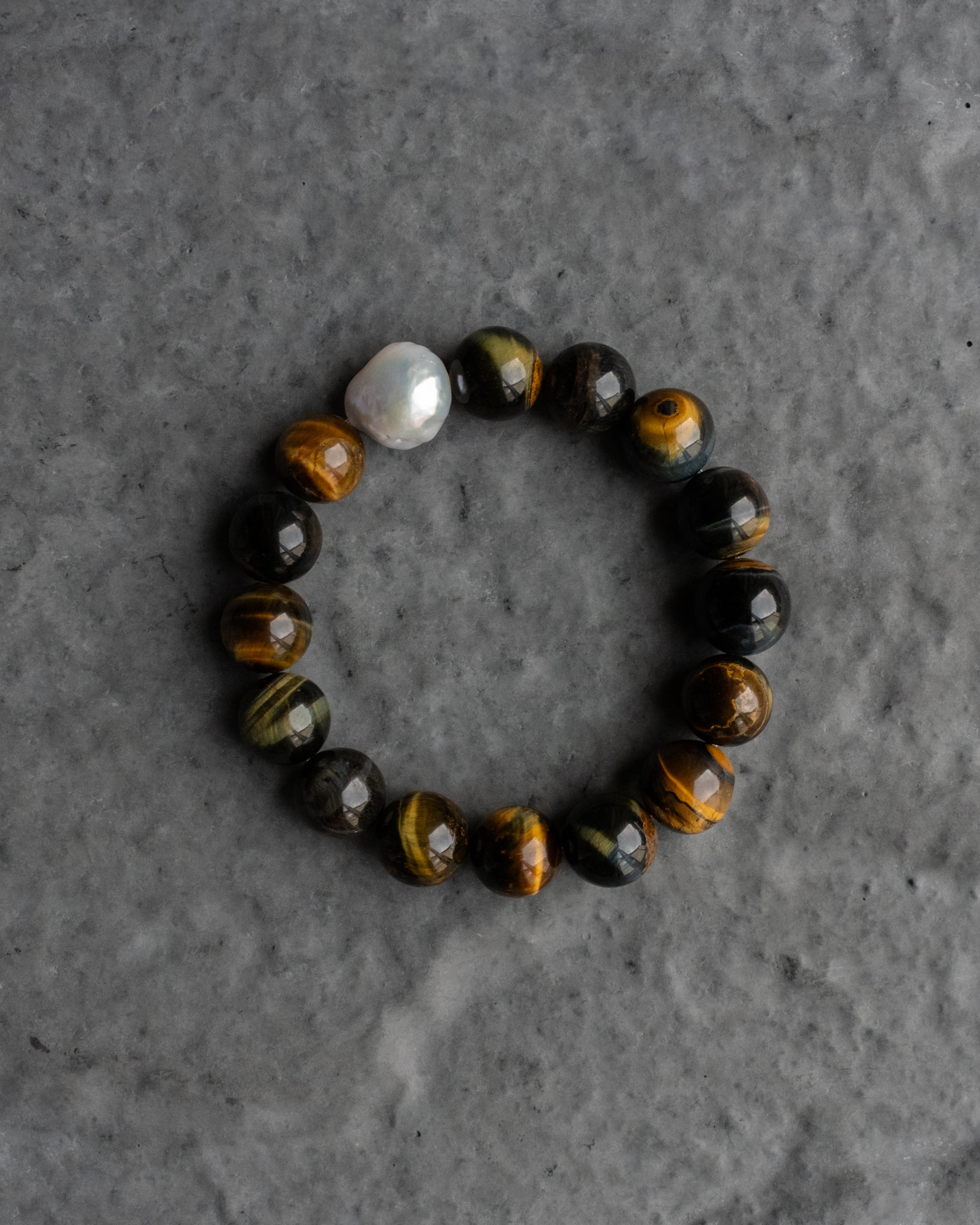 Blue tiger's eye bracelet with a single vintage fresh water pearl. Great for stacking or wearing on its own.