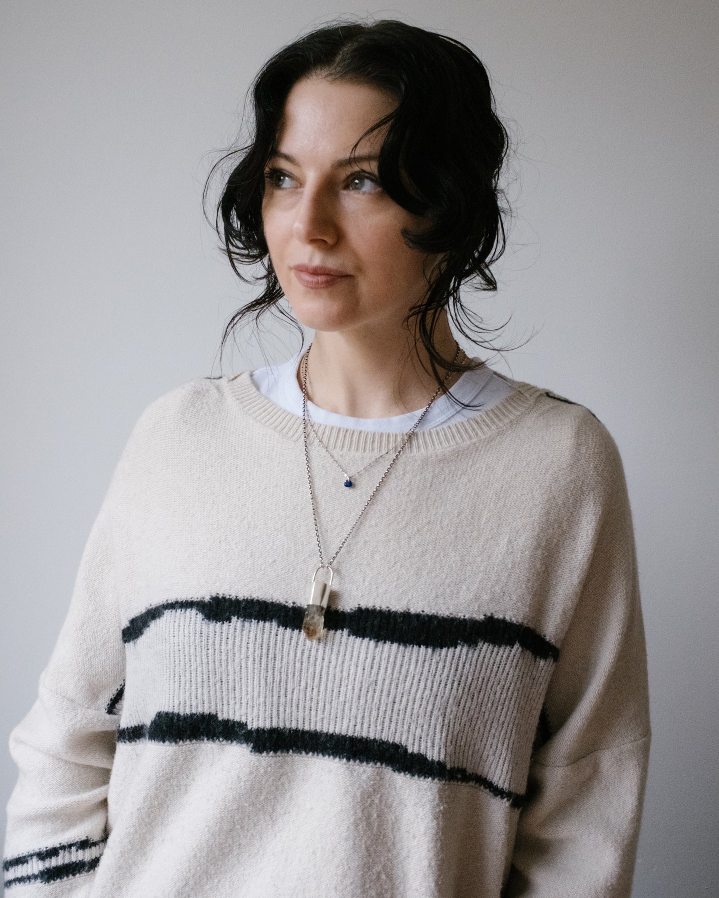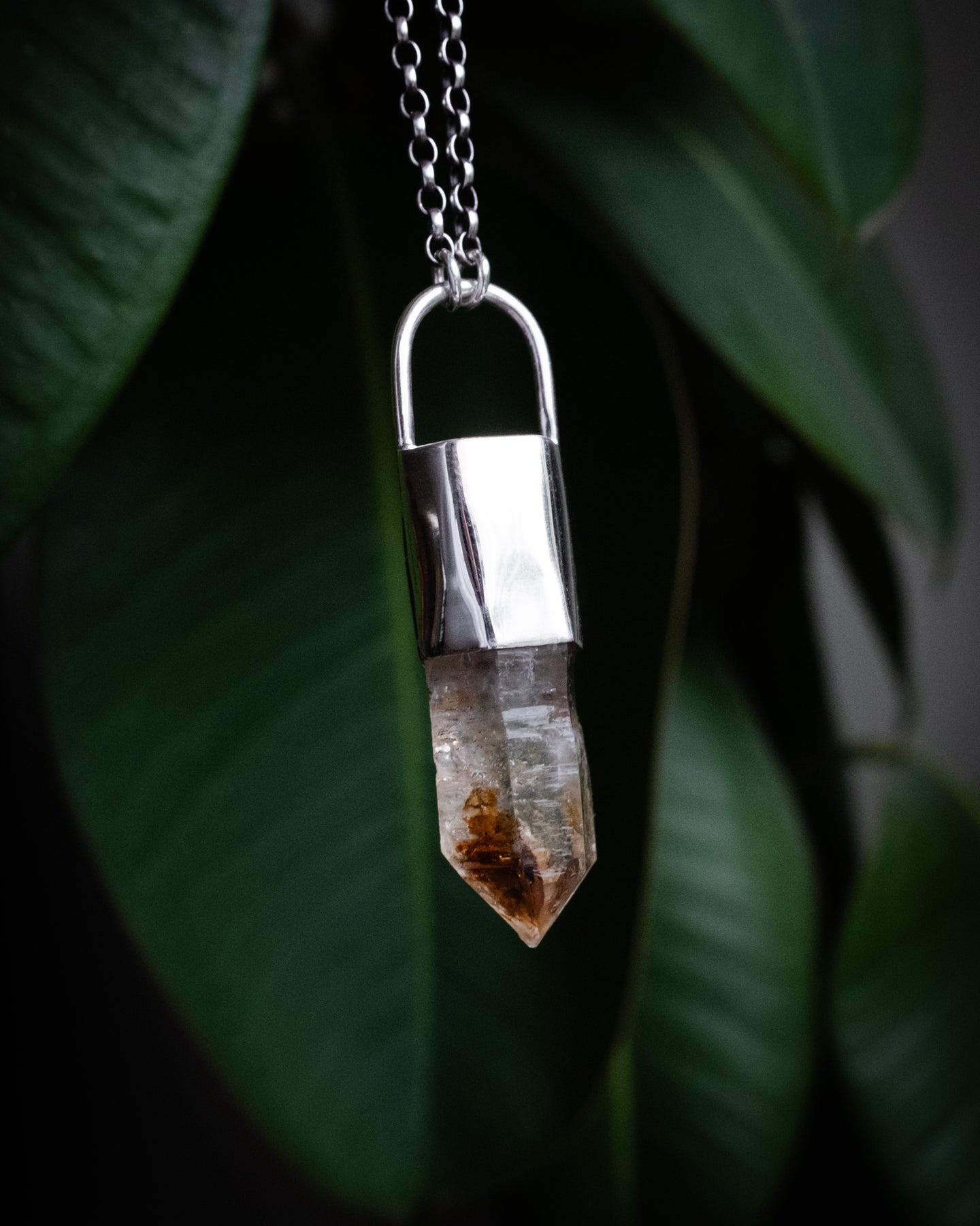A powerful petroleum quartz point from Pakistan set in recycled 925 sterling silver. Finished with a mirror-like high polish, and hangs on a thick 22" oxidised sterling silver belcher chain.