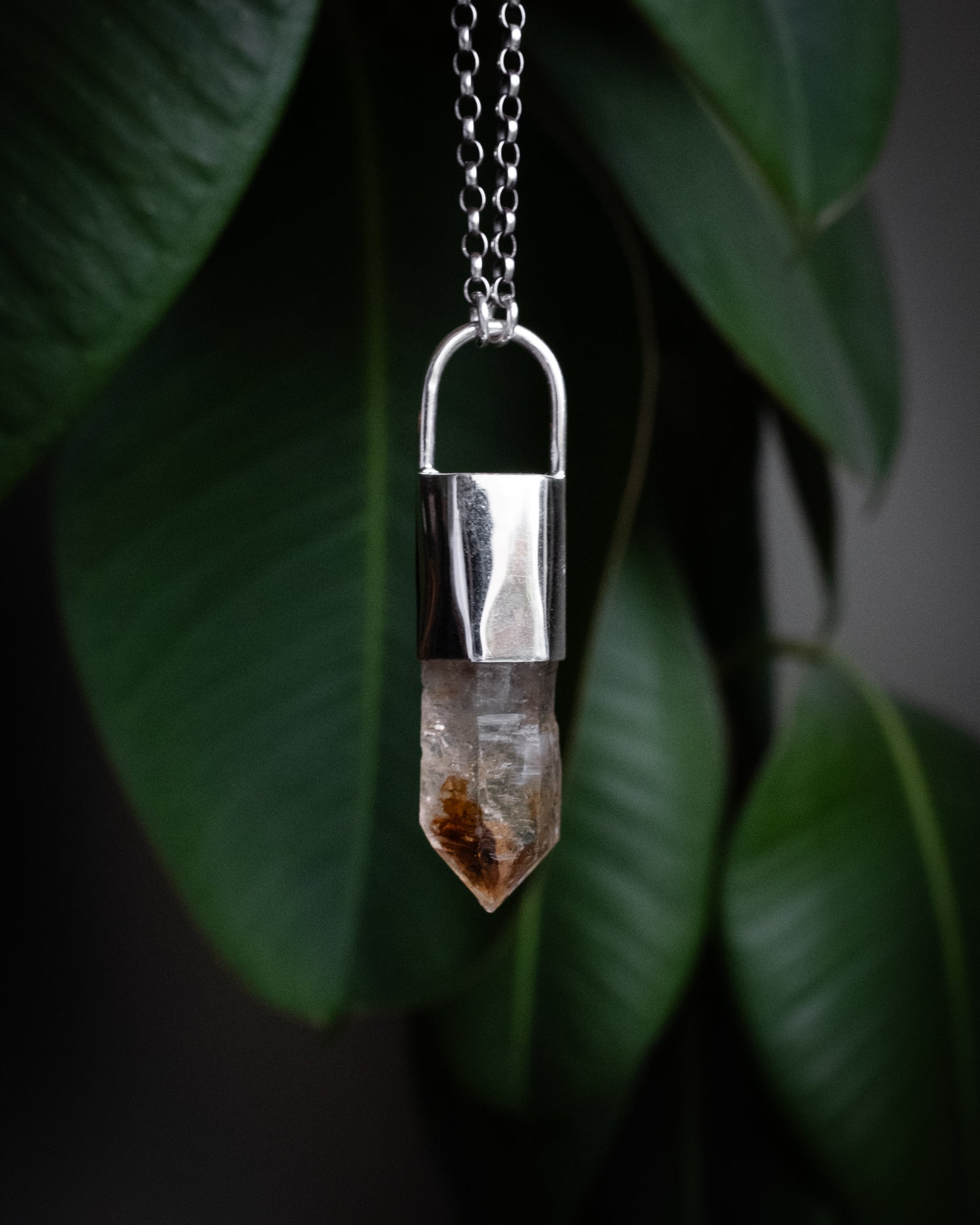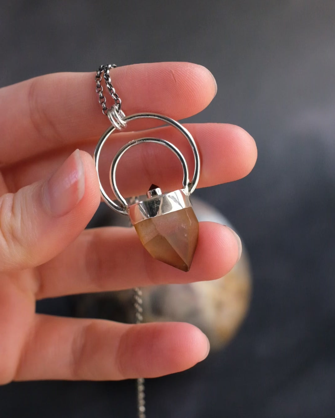 An amulet for those drawn to earthly and intergalactic magick. Featuring a stunning and powerful golden amethyst point paired with a tiny faceted garnet, set in recycled sterling silver.